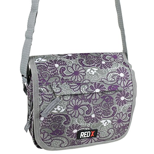 - This is a really useful Smallish Cross Body /Shoulder Bag, ideal for Ladies or Girls it has so many uses, Travelling/Walking the Dog/Work or just nipping out to town etc, the list is endless just a well designed bag. Made by RED X a new brand that I'm sure we are going to hear a lot about. Available in Grey with Purple Floral Detail.